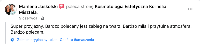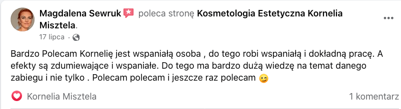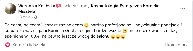 "Jestem zachwycona efektami! Po kilku dniach od zabiegu zauważyłam, że skóra stała się napięta, moja skóra jest bardziej nawilżona i elastyczna, a dodatkowo zmarszczki nsą znacznie mniej widocznie. Jestem w szoku! Zabieg był szybki i bezbolesny, a Pani Kasia miła i uprzejma. Jestem bardzo zadowolona z rezultatów i polecam ten zabieg innym kobietom w moim wieku, które chcą poprawić wygląd swojej skóry."