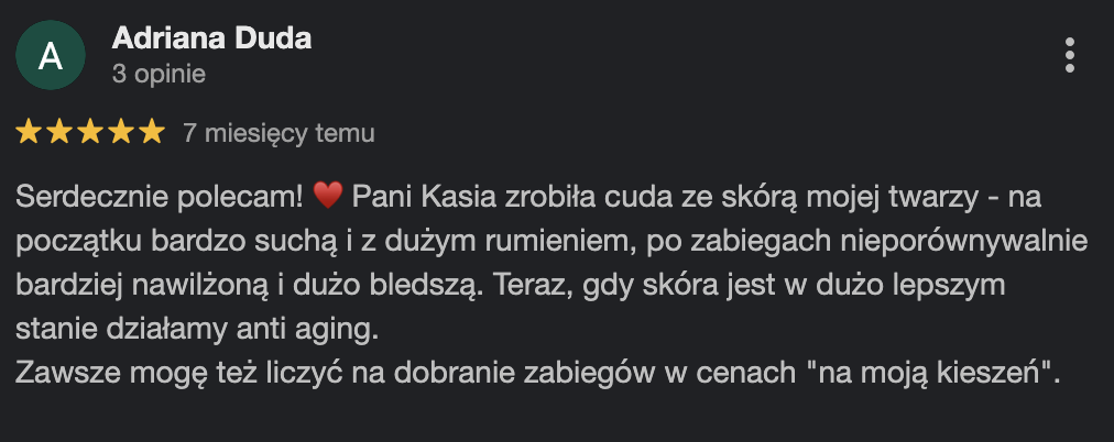 Polecam zabiegi u Pani kosmetolog Karoliny, wykonałam wodorowe oczyszczanie i nie żałuję. Moja skóra stała się promienna, nabrała blasku, koloryt znacznie się poprawił, a niedoskonałości praktycznie nie widać